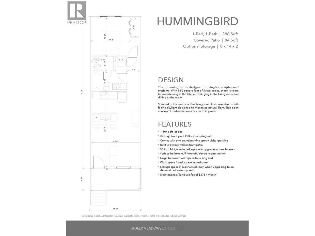 Welcome to Deer Meadows. Conveniently located just steps away from the Rail Trial where you are connected to Wood lake and the blue waters of Kalamalka lake with trail access spanning from Vernon to Kelowna. Deer Meadows is a quick 10 minute commute from the Airport and UBCO's Campus. Rentals and pets are allowed. This Hummingbird home is built by Woodland Crafted Homes and features a modern layout great for singles, couples and students. With 588 square feet of space, there is room for entertaining in the kitchen, lounging in the living room and dining at the table. Situated in the centre of the living room is an oversized south facing skylight designed to maximize natural light. This open concept 1 bedroom home is our base model comes with a fenced yard and is sure to impress! Many upgrades are available to customize this home to your needs. Enjoy every bit of sunshine that the Okanagan has to offer. SHORT TERM RENTALS PERMITTED. Schedule your appointment today! (id:6769)