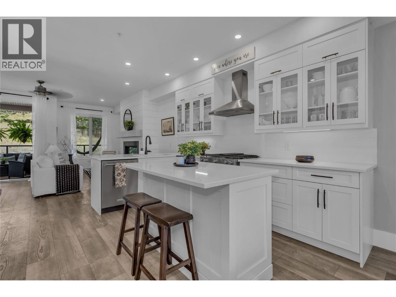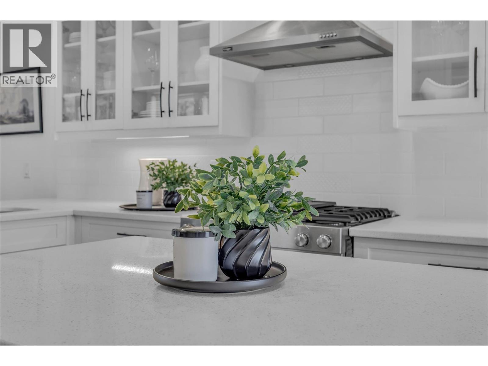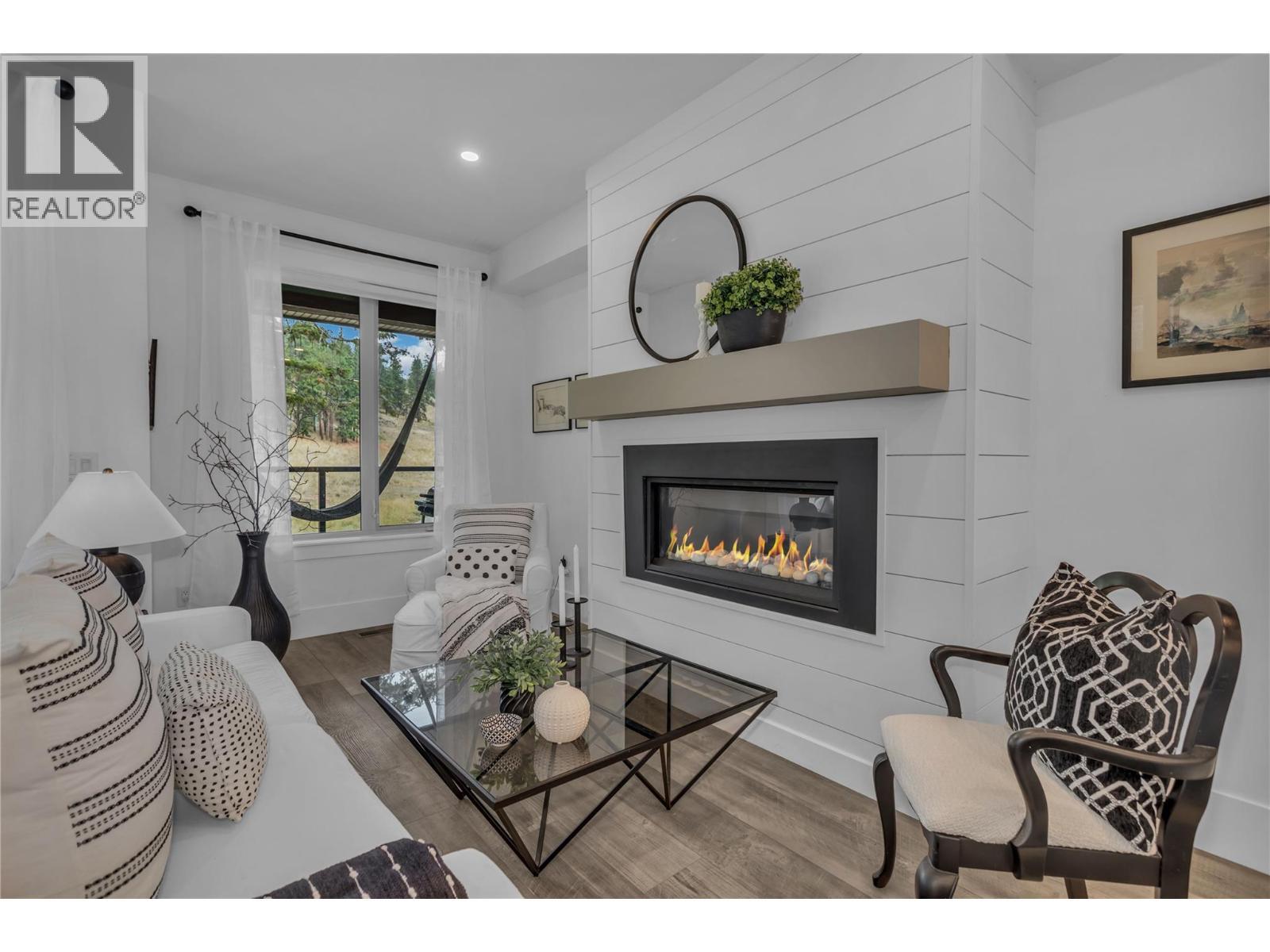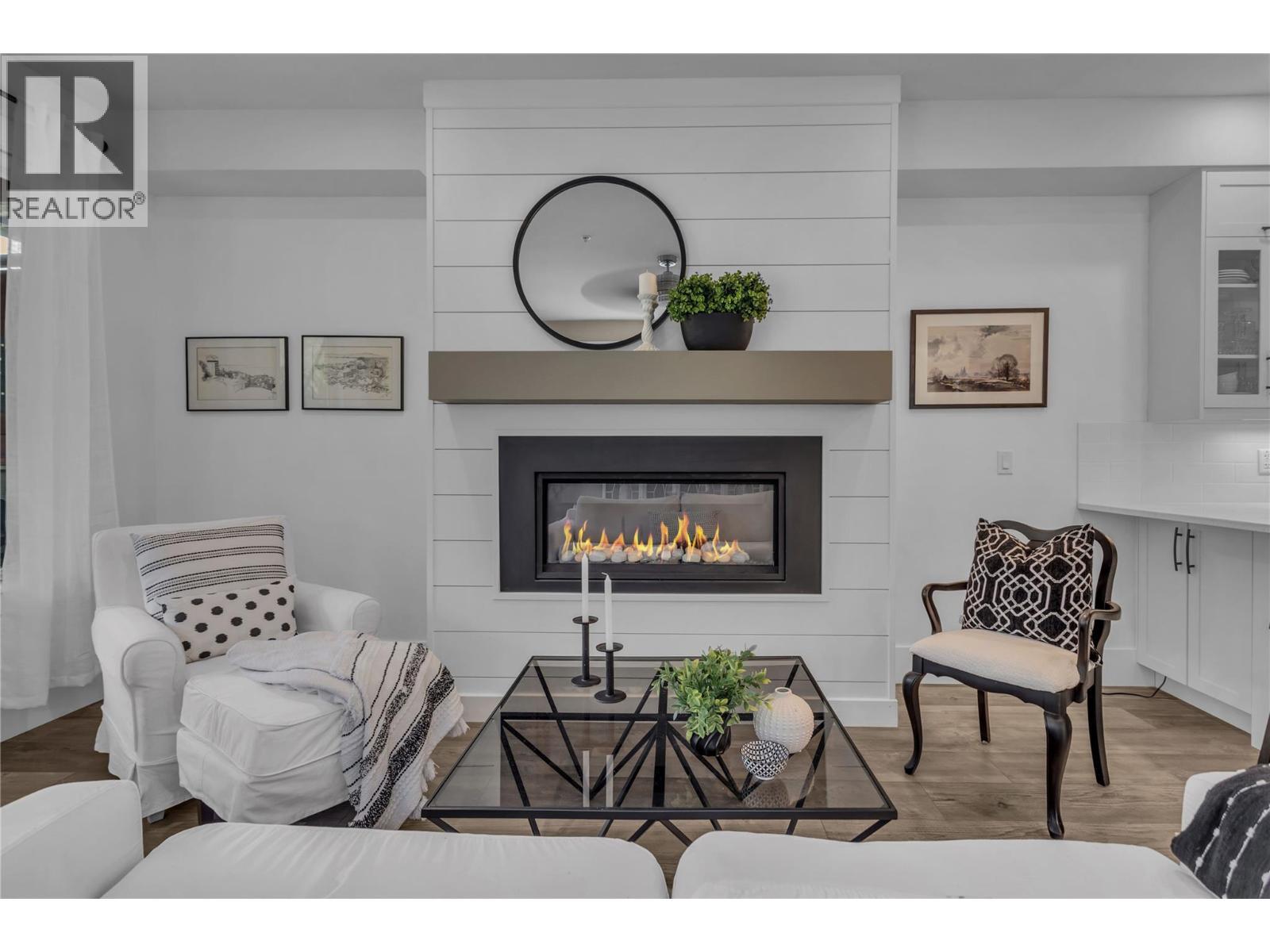 Welcome to The Trails! Backing onto Pincushion Mountain and steps from Hardy Falls and endless scenic trails, this location couples nature with convenience. An executive 9-hole golf course is approved next door, while Beach Avenue’s shops, restaurants, parks, marinas, wineries, and microbreweries are just minutes down the hill. This exceptional end unit presents like a show home. The craftsman exterior with Hardie board siding, rich wood and slate accents, and a stamped concrete entry sets the tone for the quality throughout. Inside, soaring ceilings and expansive windows flood the home with natural light, creating an open, airy atmosphere. The main living level is designed for entertaining, featuring a stunning white kitchen with upgraded cabinetry, quartz countertops, custom backsplash, premium appliances, and refined hardware. The living room is anchored by a cozy natural gas fireplace with a solid wood mantle and elegant shiplap detail. Two inviting covered decks on this level offer private views from both sides of the home. Upstairs offers 3 generous bedrooms and 2 full bathrooms, including a serene primary retreat with vaulted ceilings and transom windows. On the entry level, a large rec room with a 2nd fireplace opens directly to the patio — ideal for guests or seamless indoor-outdoor living. Phantom screens throughout, an oversized tandem garage with abundant storage for all your lifestyle gear, and the peace of mind of a FireSmart community. (id:6769)