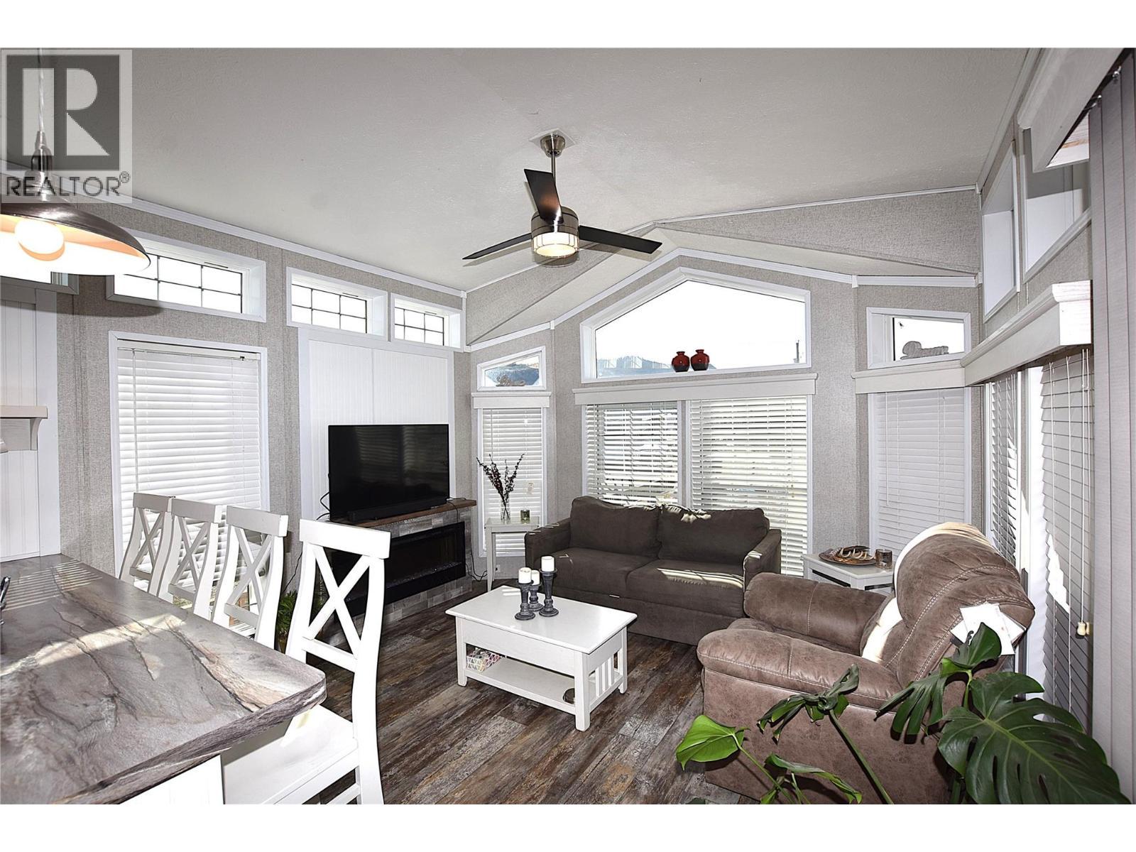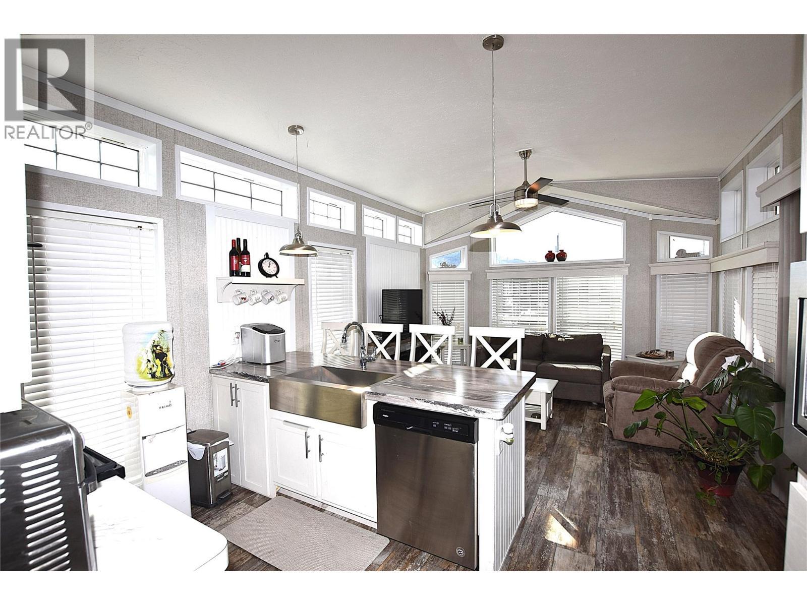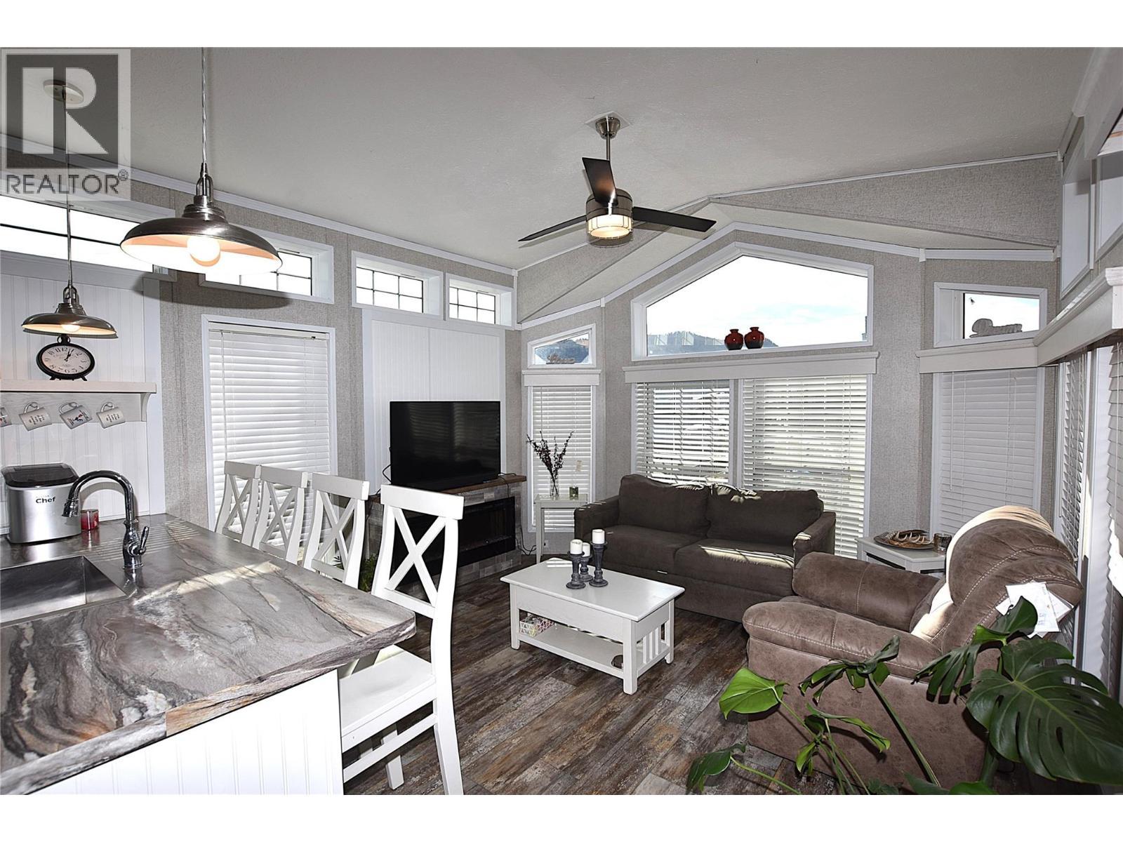 Welcome to #5–65 Antoine Road, a beautifully maintained 8-year-old Park Model home in Willow Lake Side Homes MHP—just 10 minutes from Vernon and less than 5 minutes to the golf course. This bright and inviting home features an open-concept main living area with vaulted ceilings and an abundance of windows, filling the space with natural light. The kitchen is thoughtfully designed with a large island, farmhouse-style sink, and stainless steel appliances—including a dishwasher—making it both stylish and functional. The living room offers a charming bay window and a cozy electric fireplace, perfect for adding warmth and ambiance on cooler evenings. The bedroom is well-appointed with two closets featuring built-in drawers, plus additional built-in storage above the bed for maximum organization. Step outside to enjoy the spacious 9' x 22' covered deck—ideal for relaxing or entertaining throughout the spring, summer, and fall. The fully fenced yard provides privacy, ample gardening space, and includes a 10' x 8' shed for extra storage. Additional features include: Soft water system Carport plus two additional parking spots Access to Okanagan Lake The pad rental is an affordable $400/month and includes water, sewer, garbage, road maintenance, and lake access. An excellent condo alternative for anyone looking to enjoy affordable living in the Okanagan, close to the lake and all amenities. (id:6769)