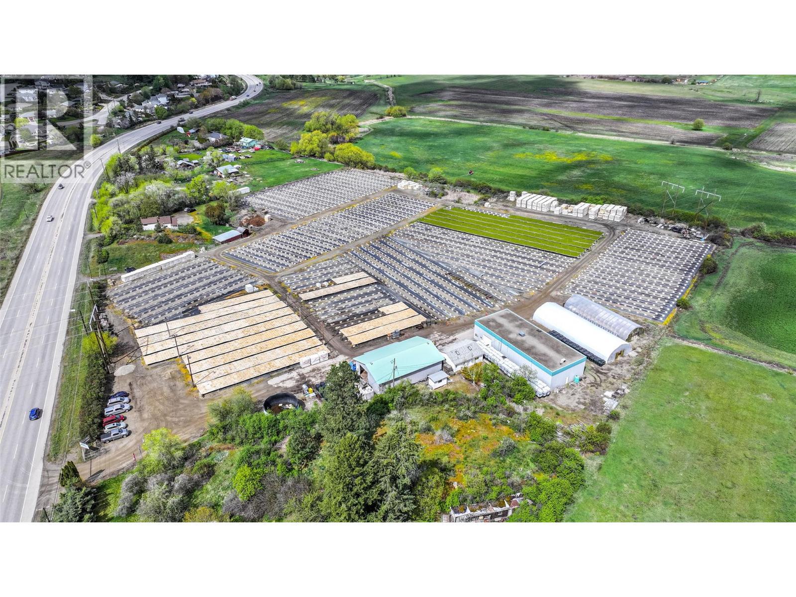 Amazing potential for income production and growth! Perfect for a fruit producer that needs a cold storage facility and a great high exposure easily accessible highway 6 location. This farm is located on 8.24 acres of gently sloped, to flat, ALR land just past Hillview Golf course at the eastern boundary of the City of Vernon. The current lease with PRT Nurseries has just expired and the commercial facility will be vacant at the end of March 2026. The residential home is tenant occupied and rents for $2,000 per month. Residential Tenancy Act. The Commercial Buildings for the Nursery Business, include an office, a cold storage facility, and other storage buildings. PRT (Pacific Regeneration Technologies Inc.)a forest seedling nursery, had leased the land and buildings since 2005 and has now terminated their lease. This is the perfect opportunity for another entrepreneurial agricultural business to flourish in this location. The Commercial buildings alone are valued at over 1 million dollars. 40x100, 40x64, 24x32 commercial buildings, a nicely maintained 1960's rancher home home with basement, detached garage, and swimming pool on 8.24 acres of fertile Coldstream Valley bottom farmland. Don't miss out on this great opportunity - This property also has farm status ( hence low BC Assessment & taxes) agricultural farm water allocation, and a south west facing aspect, making it perfect for very fertile growth. (id:6769)