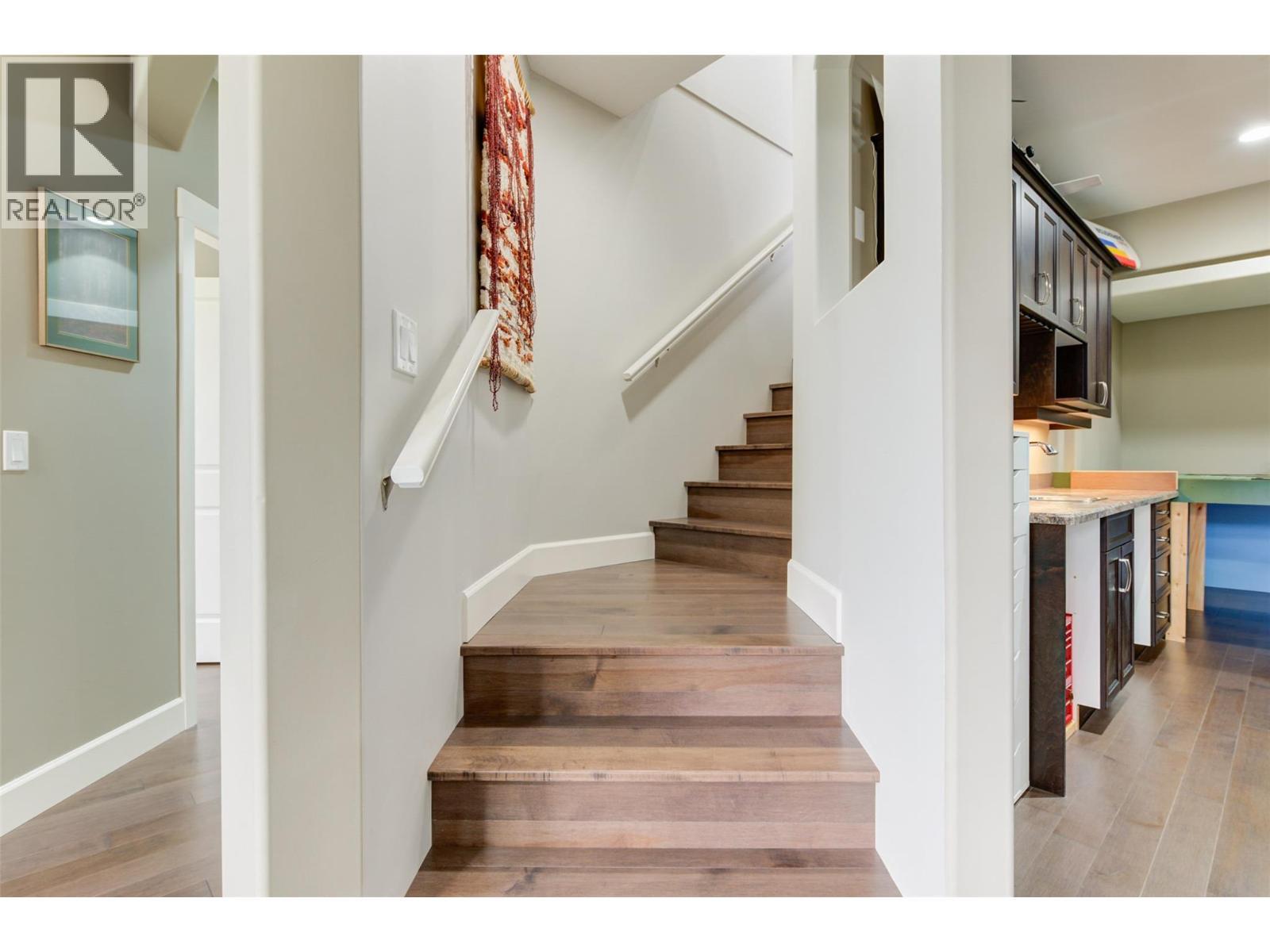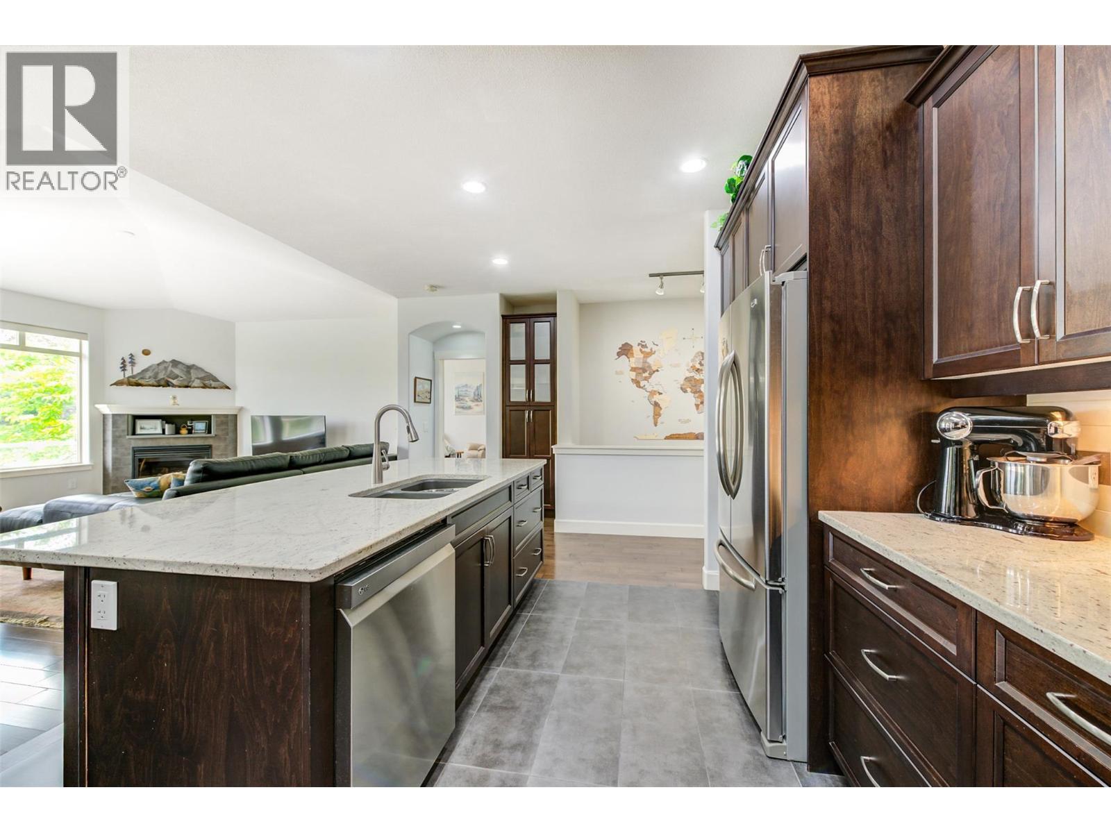 Discover refined comfort and effortless living in this impeccably maintained former show home, ideally located in the sought-after Canyon Ridge 55+ gated community. Thoughtfully designed and move-in ready, this 3-bed, 3-bath home offers open-concept living, a versatile den, and inviting outdoor spaces. Step inside to warm hardwood floors, vaulted ceilings, and abundant natural light. The spacious living room features expansive windows framing beautiful mountain views with a glimpse of the lake, creating a bright, airy feel. The gourmet kitchen is both stylish and functional, with granite countertops, a generous island, stainless steel appliances, and ample cabinetry. A skylight enhances the space, while the gas cooktop and wall oven make cooking a pleasure. The main-floor primary suite offers a peaceful retreat with a walk-in closet and well-appointed ensuite. A front-facing den is perfect for a home office or flex space, while a second bedroom, full bath, and laundry complete the main level. Downstairs, the finished lower level adds flexibility with a spacious family room and games area, separated by a striking double-sided gas fireplace ~ ideal for relaxing or hosting. Outdoor living shines with a large deck showcasing mountain and partial-lake views, plus a lower patio extending your living space. Residents enjoy a clubhouse with lounge, kitchen, banquet room, and library. Minutes to Glen Canyon Regional Park, Okanagan Lake, and amenities, this home blends tranquility, convenience, and low-maintenance living. (id:6769)