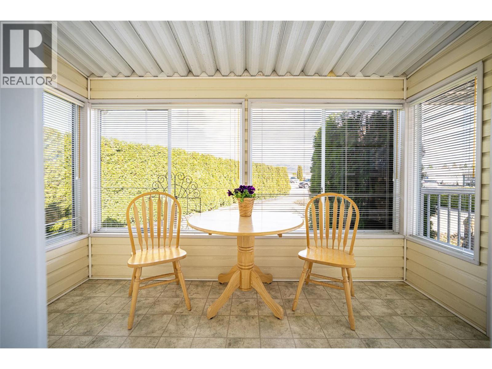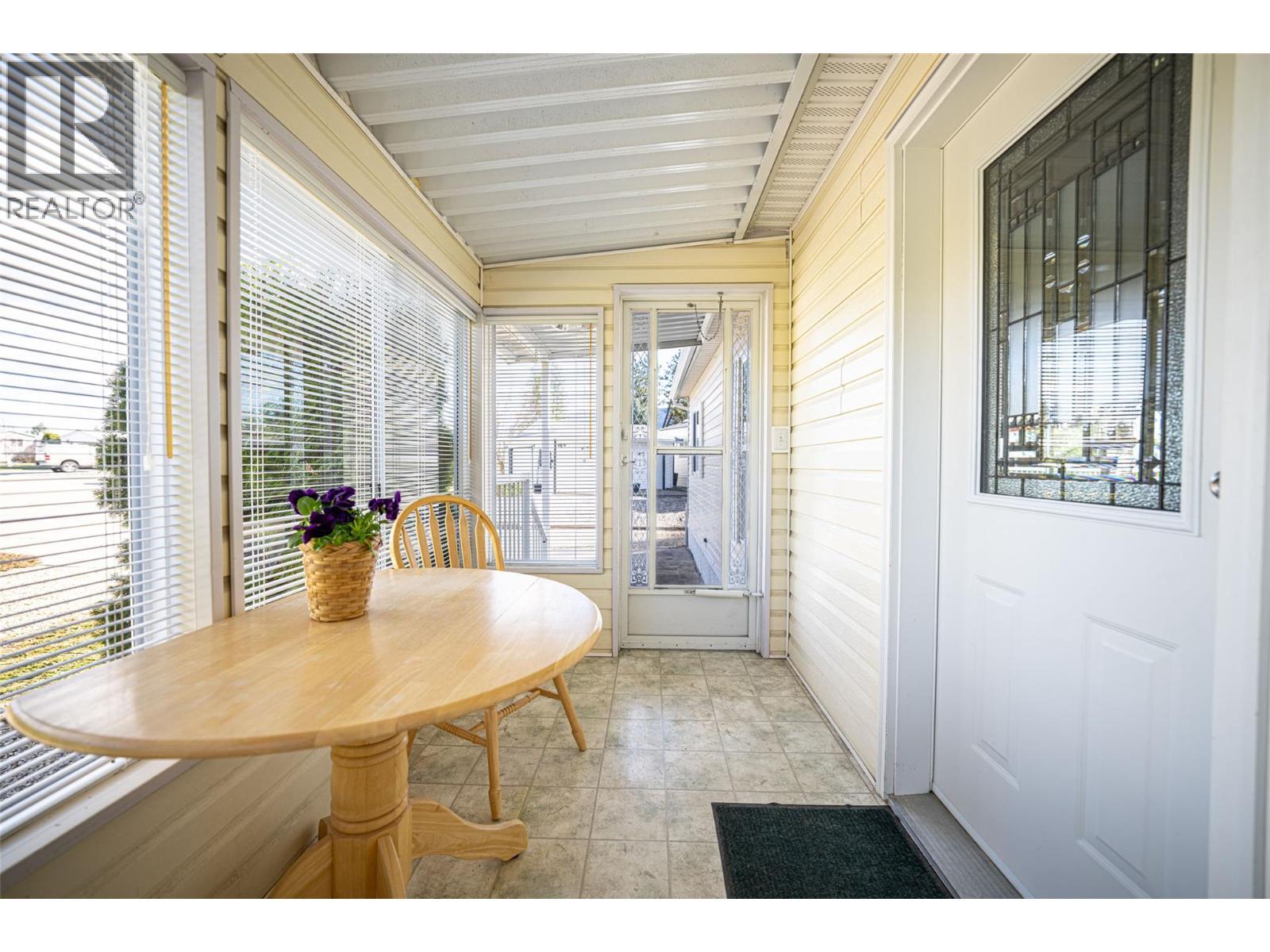 This is an exceptionally well-maintained 2-bedroom plus den, 2-bathroom manufactured home. The property has been meticulously cared for and remains in excellent condition. The interior features a spacious open-concept kitchen with ample cupboards, storage and four pull-out cupboard shelves. Both bathrooms include modern fixtures and granite countertops. The home is drywalled with new vinyl plank flooring throughout and large windows providing a bright atmosphere and a relaxing enclosed porch. Significant upgrades include a 35-year roof (installed in 2014), a water softener and reverse osmosis system, a newer hot water tank, and a new dishwasher. The exterior offers a large private yard and a sundeck with views of Okanagan Lake and Spall Golf Course. The grounds include a fire pit, multiple garden areas with perennials, and an automated watering system. Additionally, the property provides a 12' x 16' workshop, a storage shed, and ample parking for both vehicles and an RV. (id:6769)