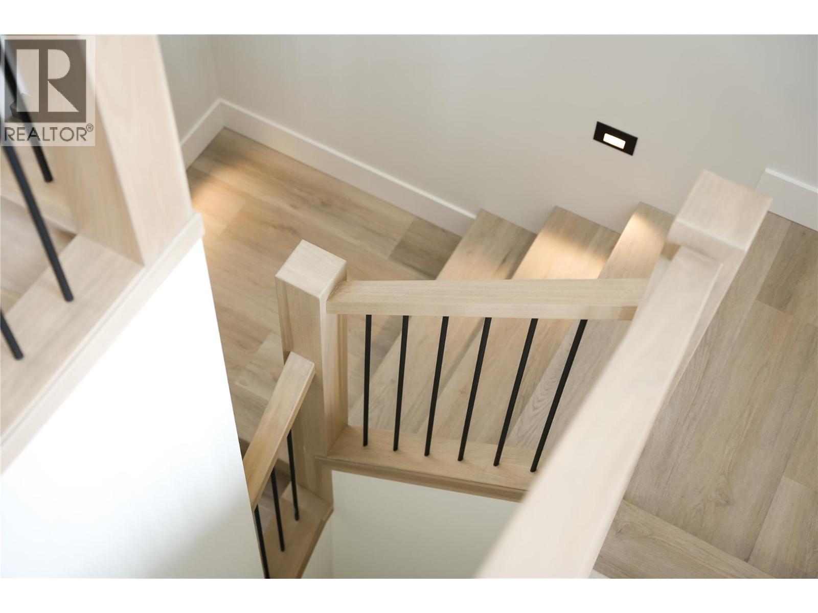 Elevated Living | This modern four level home offers over 2,100 square foot of thoughtfully designed living space,combining single-family comfort with low-maintenance convenience.The 600 square foot oversized garage accommodates vehicles and outdoor gear.The ground floor features a private office and powder room—ideal for working from home with separate client access. The second floor includes three bedrooms, two full baths, and laundry, highlighted by a spacious primary suite with walk-in closet, custom shelving, double vanity and frameless glass shower.The third floor showcases an open-concept kitchen,living,and dining area with premium finishes—stone countertops, wall oven, induction cooktop and walk-in pantry—flowing seamlessly through accordion glass doors to over 850 square feet of outdoor living space. A covered balcony on the third level is prepped for a hot tub and the fourth level rooftop terrace captures stunning Okanagan views, creating a true indoor-outdoor lifestyle. Designed for long-term comfort, a hybrid personal elevator ensures easy access to all floors, supporting aging in place with widened doorways and accessible layouts. Built to advanced energy standards, this home minimizes utility costs and supports sustainable living. Located in vibrant Kelowna, enjoy walkable access to Parkinson Rec Centre, fitness studios, cafes and dining, easy biking to downtown, beaches, wineries, and parks, plus nearby shopping, farmer market, and recreation.A rare blend of space,efficiency and future-ready design. (id:6769)