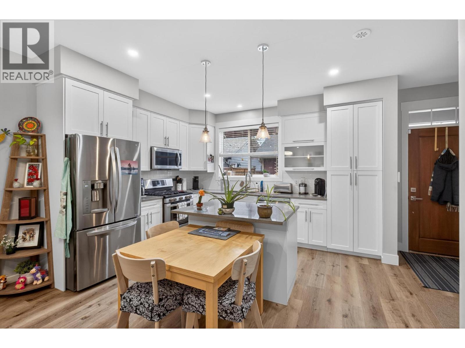 Welcome to this beautifully appointed back-unit home in the heart of Kelowna South—where lifestyle and location come together. Just steps from the Ethel biking corridor, you can bike or stroll with ease to vibrant Pandosy Village or downtown Kelowna. This modern 3-bedroom, 2.5-bath home offers an open-concept main floor designed for comfortable living and entertaining. Featuring durable vinyl plank flooring throughout the main level, the spacious kitchen showcases stainless steel appliances, quartz countertops, and is roughed-in for either a gas or electric range—offering flexibility for your cooking preference. The kitchen flows seamlessly into the living room with a cozy gas fireplace. Enjoy year-round comfort with natural gas heating, central air, and hot water on demand. Upstairs you’ll find all three bedrooms, including a generous primary suite complete with a large walk-in closet and private ensuite. Two additional bedrooms and a full bathroom provide flexibility for family, guests, or a home office. Step outside to a fully fenced yard with low-maintenance SynLawn and a convenient gas BBQ outlet—perfect for summer evenings. The detached garage includes additional storage above, ideal for bikes and seasonal gear. No strata fees and pets allowed—offering freedom and flexibility without compromise. A rare opportunity to own a stylish, low-maintenance home in one of Kelowna South’s most desirable neighbourhoods. (id:6769)